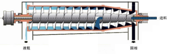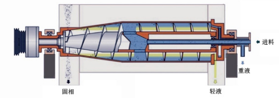 主機(jī)啟動(dòng)達(dá)到加料轉(zhuǎn)速,進(jìn)料閥打開(kāi)懸浮液連續(xù)進(jìn)入機(jī)內(nèi),經(jīng)螺旋輸送器的內(nèi)筒出料口進(jìn)入轉(zhuǎn)鼓內(nèi),在離心力的作用下,懸浮液在轉(zhuǎn)鼓內(nèi)形成一環(huán)形液流,固體顆粒在離心力的作用下沉降到轉(zhuǎn)鼓內(nèi)壁上,由于差速器的差動(dòng)作用使螺旋輸送器與轉(zhuǎn)鼓之間形成相對(duì)運(yùn)動(dòng),沉渣被螺旋推送到轉(zhuǎn)鼓小端的干燥區(qū)進(jìn)一步脫水,然后經(jīng)出渣口排出。液相形成一個(gè)內(nèi)環(huán),不斷的經(jīng)轉(zhuǎn)鼓大端溢流孔排出。如液相是含有輕、重兩相的乳濁液,由于比重不同,形成輕、重兩液環(huán),從轉(zhuǎn)鼓大端排出機(jī)外。