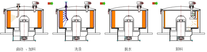 電機帶動皮帶輪驅(qū)動轉(zhuǎn)鼓繞自身軸線高速回轉(zhuǎn),物料在預(yù)先編制的程序控制下,通過進料系統(tǒng)進入高速旋轉(zhuǎn)的轉(zhuǎn)鼓內(nèi)。在離心力的作用下,物料均布在過濾介質(zhì)上進行脫液分離,液相透過固相物料和濾網(wǎng)縫隙,經(jīng)鼓壁孔甩至機殼空間,從出液口排出機外,固相物料截留在轉(zhuǎn)鼓內(nèi)形成濾餅。料層檢測裝置實時檢測物料的充填位置,當(dāng)濾餅達到事先設(shè)定的位置時,自動關(guān)閉加料閥,停止進料,然后對濾餅進行洗滌、脫水,待達到要求后,離心機降到卸料速度,刮料器在液(氣)動控制下將濾餅刮下,經(jīng)轉(zhuǎn)鼓底上的出料口卸出。
