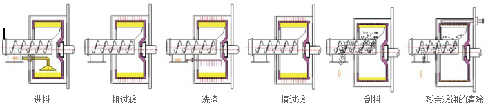 電機帶動皮帶輪驅(qū)動轉(zhuǎn)鼓繞自身軸線高速回轉(zhuǎn),物料在預(yù)先編制的程序控制下,通過進料系統(tǒng)進入高速旋轉(zhuǎn)的轉(zhuǎn)鼓內(nèi)。在離心力的作用下,物料均布在過濾介質(zhì)上進行脫液分離,液相透過固相物料和濾網(wǎng)縫隙,經(jīng)鼓壁孔甩至機殼空間,從出液口排出機外,固相物料截留在轉(zhuǎn)鼓內(nèi)形成濾餅。料層檢測裝置實時檢測物料的充填位置,當濾餅達到事先設(shè)定的位置時,自動關(guān)閉加料閥,停止進料,然后對濾餅進行洗滌、脫水,待達到要求后,離心機降到卸料速度,卸料閥打開,刮料器在液動控制下旋轉(zhuǎn)上升,將濾餅刮下掉進螺旋出料器,經(jīng)出料閥排出機外。